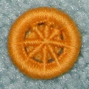 Technique: To make a Dorset button you need either a metal or plastic ring as the form. Using pearl cotton thread, blanket stitches are worked very closely around the entire ring until it is completely covered. This is called casting on. Then you slick all these stitches inwards which is turning all the bumpy ridges of the blanket stitches to the inside of the ring. Then there is the laying, which is the working of the thread across and around the ring to create a network of spoke-like threads that meet or cross at the middle of the ring. From there is the rounding which is the interweaving of thread through the spokes to fill in the inner area of the ring. The method of rounding varies depending on the style of Dorset button that is being made.