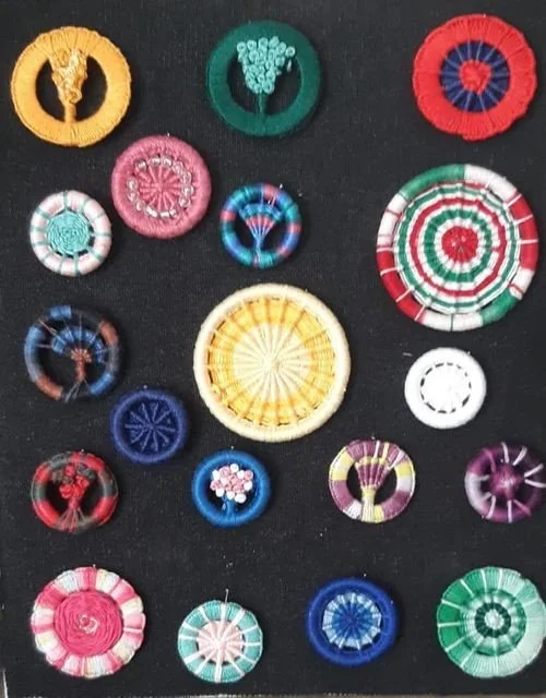 Many different styles of Dorset button emerged in the centuries of their manufacture such as Blandford Cartwheel, Basket Weaves, Ten-Spoke Yarrels, Grindles, Honeycombs, Bird’s Eyes, Mites, Cross-wheels and Singleton. Different colours of thread could be used, or if a specific colour was desired, buttons could be boiled to remove the existing colour and then re-dyed to produce a specific shade of button. The demand for this style of button grew to such a size that they started to be exported for international trade.